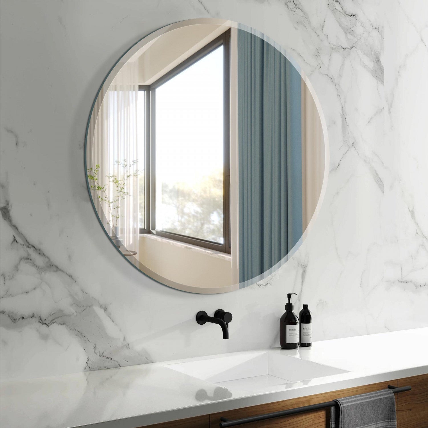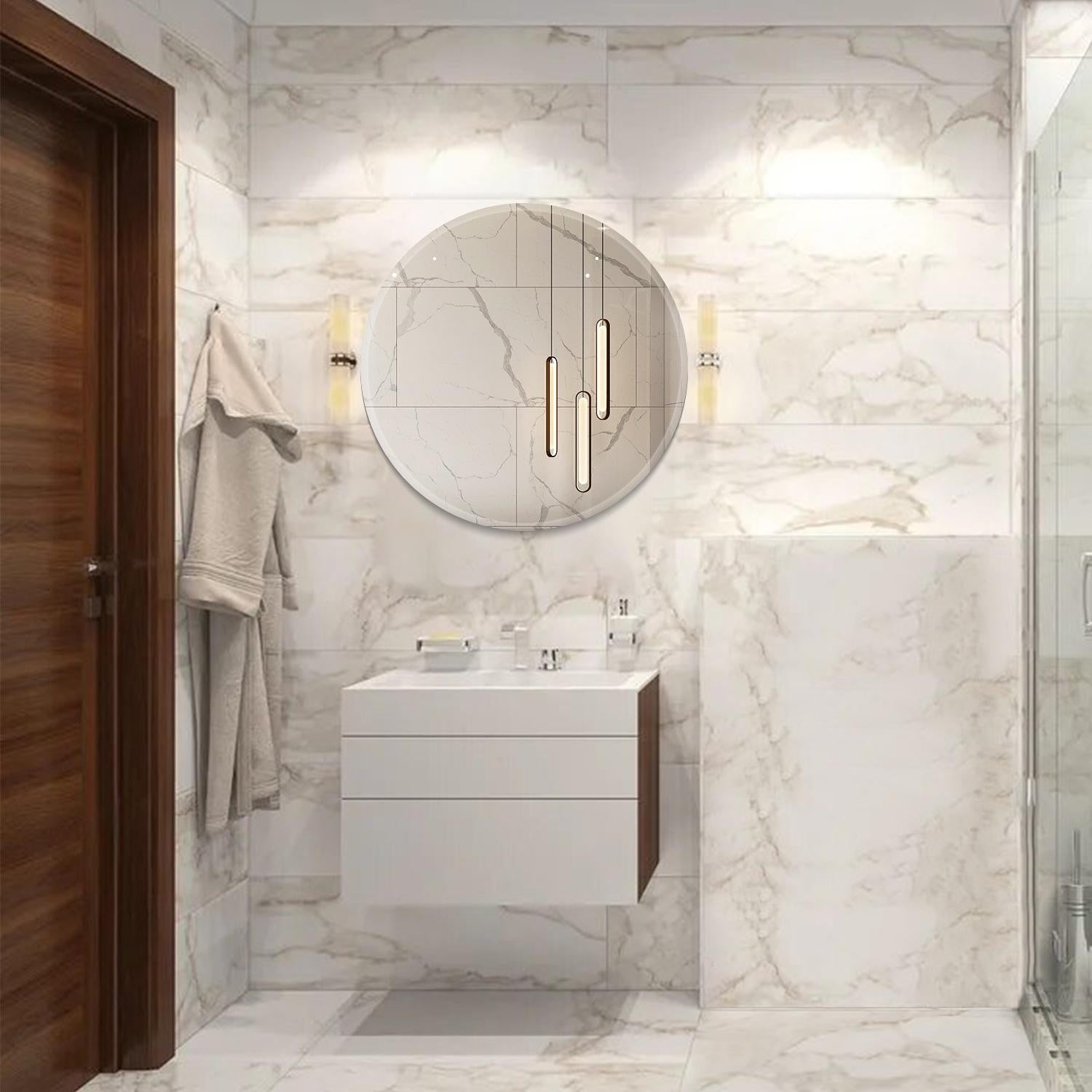 Reflect your beauty with this Arcus Home Decor circle beveled edge mirror. Arcus believes in capturing authenticity in every reflection. This high-quality mirror embodies the timeless adage that "A mirror never lies," providing you with accurate and faithful reflections that illuminate your true essence and space. This circle beveled mirror is a classic, frameless round design perfect for enhancing any bathroom, entryway or living room. With its sleek beveled edge, this gorgeous wall mirror adds a touch of sophistication to your decor. Crafted with precision and care, Arcus mirrors boast ultra-high-definition floating glass technology, ensuring the highest quality of reflected images. Experience 35% brighter reflections compared to traditional aluminum mirrors, thanks to industry-leading glass engineering. Safety is paramount in Arcus's design philosophy. This mirror is coated with an explosion-proof film, offering protection against sharp shards in case of accidents, while also simplifying maintenance. Enjoy the convenience of the innovative ultra-flush hanging system, allowing for swift installation in 10 minutes or less – all tools included.
