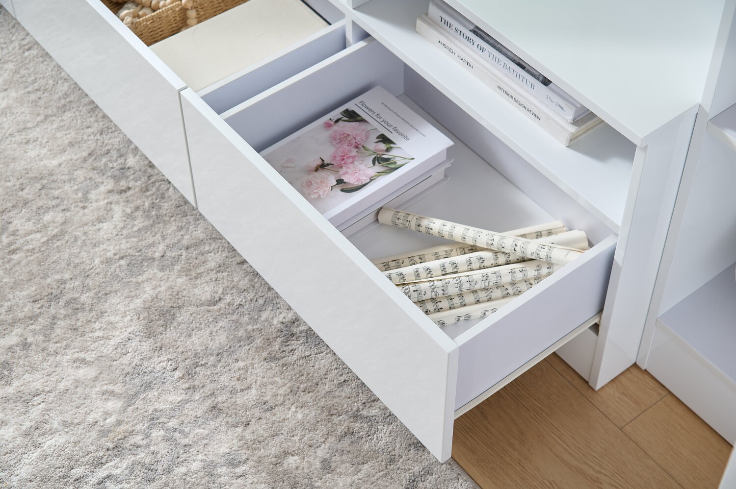 Create a clean and inviting focal point in your living room with the Celine four-piece entertainment centre. Finished in high glossy white, the contemporary design brightens your space and adds a smooth, modern feel. Open shelves and spacious drawers give you room to display decor, store media and keep everyday items neatly tucked away, while built-in cable management helps reduce clutter. Designed to support TVs up to 70 inches, the Celine entertainment centre brings together style, storage and simple comfort for everyday living.