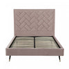 This platform bed anchors your bedroom in glam, mid-century-inspired style. It's built with an engineered wood frame and features understated side rails and footboard for a clean-lined silhouette. The headboard is upholstered in a luxurious velvet that features chevron style weave stitching. Plus, it's filled with foam for some extra cushion behind your head. Angled black iron legs with gold tips support the bed with a retro aesthetic. This bed arrives with slats and a center support leg, so you don't have to use a box spring with your choice of mattress.