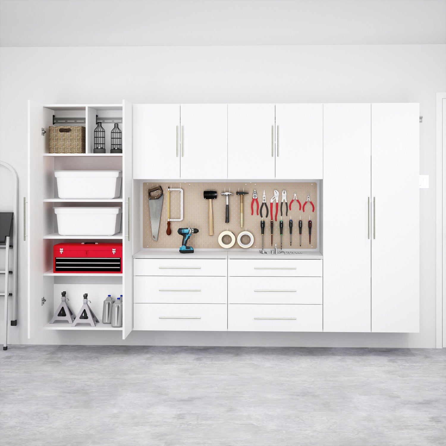 Say goodbye to clutter and welcome in a new organizational system with the prepac hang-ups 6-piece storage cabinet set. This versatile space-saving collection includes two large hang-ups storage cabinets, two hang-ups base storage cabinets, and two hang-ups upper storage cabinets. The base storage unit cabinets include three pull-out drawers on smooth roller glides, while the other cabinet units feature multiple integrated shelves, offering flexibility to fit to your ever-changing storage needs. Adorned with a light gray laminate finish and satin nickel-finished metal pull handles, these multi-use utility cabinets blend right into your home. Designed to be secured into a sturdy wall with the included heavy duty metal rail and hook system, your stowed items will be kept safe from debris while allowing for easy clean-upon the ground or other surfaces underneath. Create your ideal workspace in your garage or workshop, arranging this expansive collection to your preference. These durable cabinets ship flat packed and ready to be assembled upon delivery with an included instructional booklet, hanging rails and fastening bolts. Each organizer unit is made with non-toxic, carb-2 compliant laminated composite woods. Measuring 16"d x 120"w x 72"h total, there is no limit to what you can safely stow away.