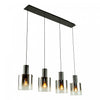 The "Henley" collection 4 light linear island chandelier features smoke type glassware, and black hardware suspended on wires.
