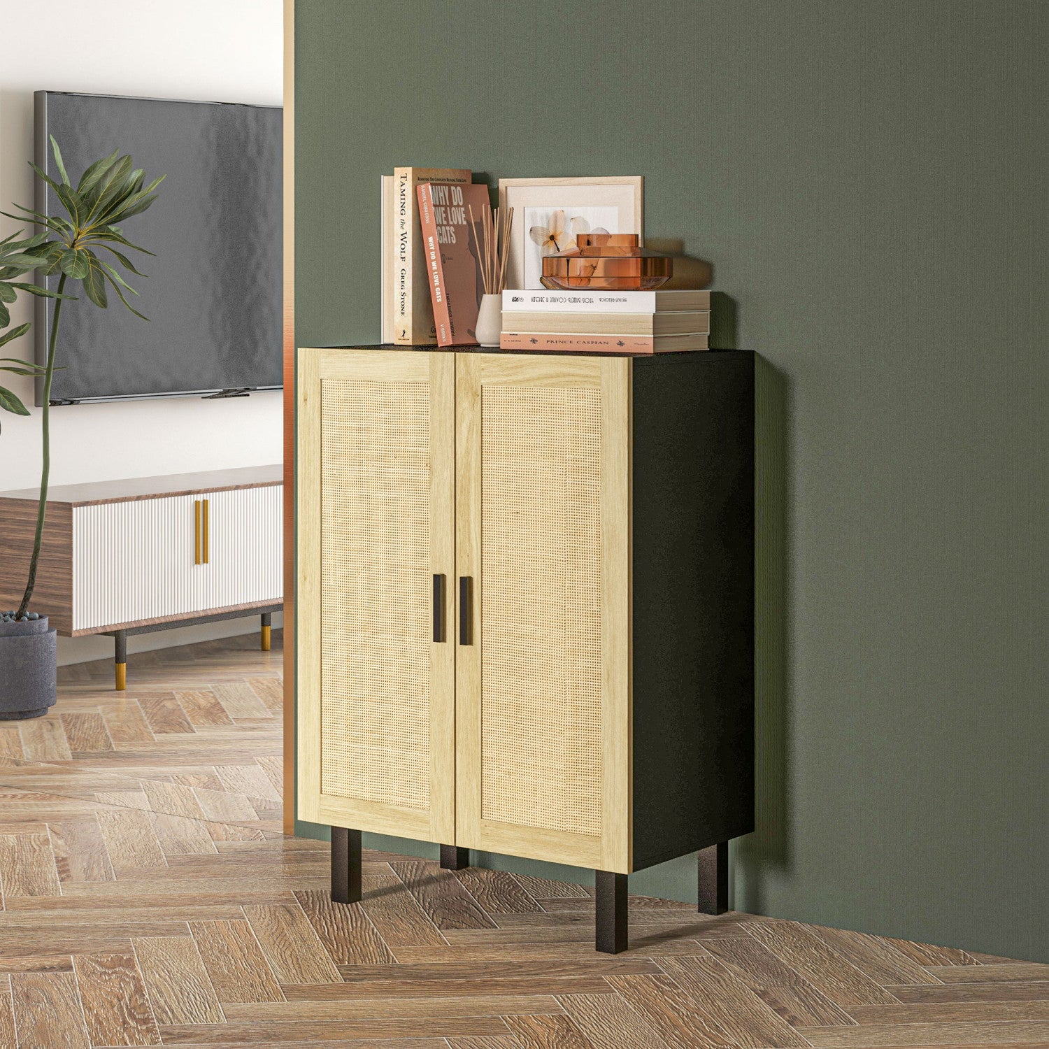 HOMCOM Boho Sideboard Buffet Cabinet with 2 Rattan Doors, Black