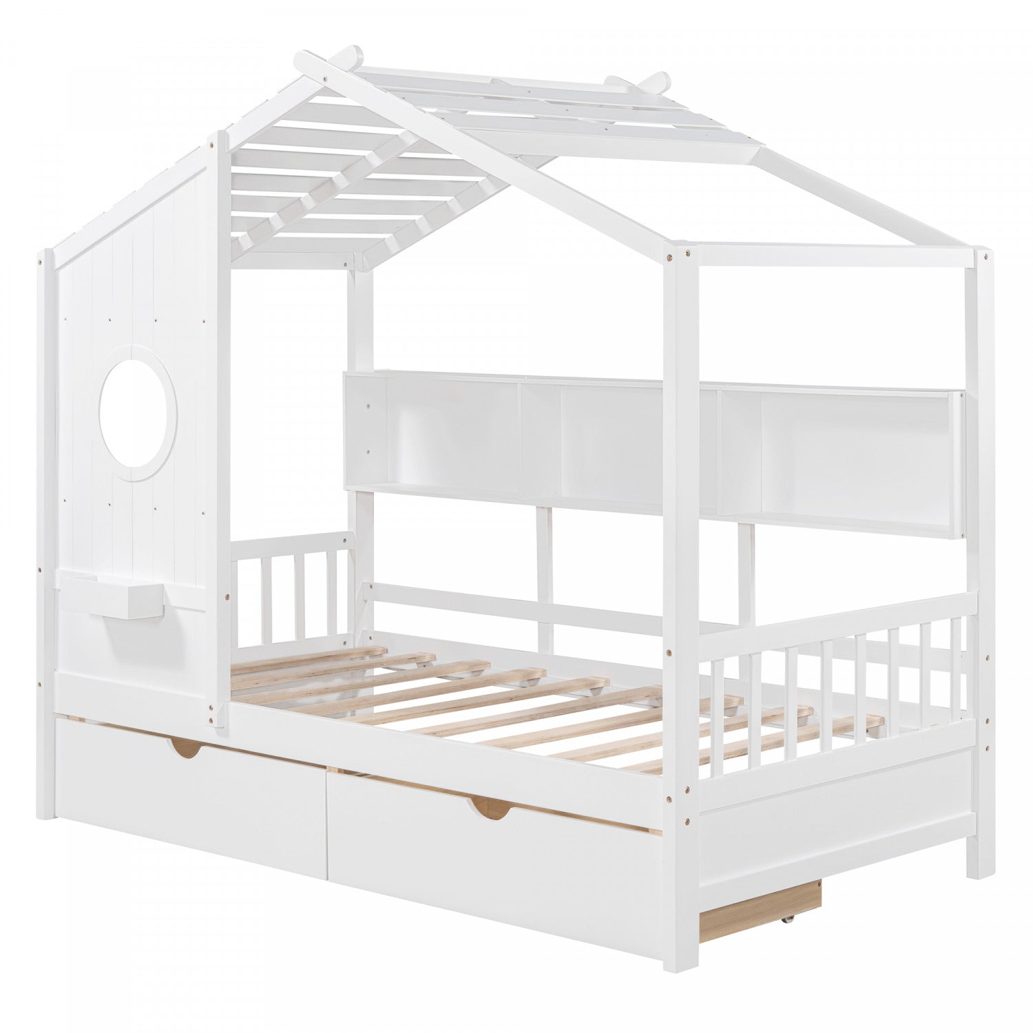 Jeames Wood House Bed with 2 Storage Drawers and Shelf,Twin Size - White