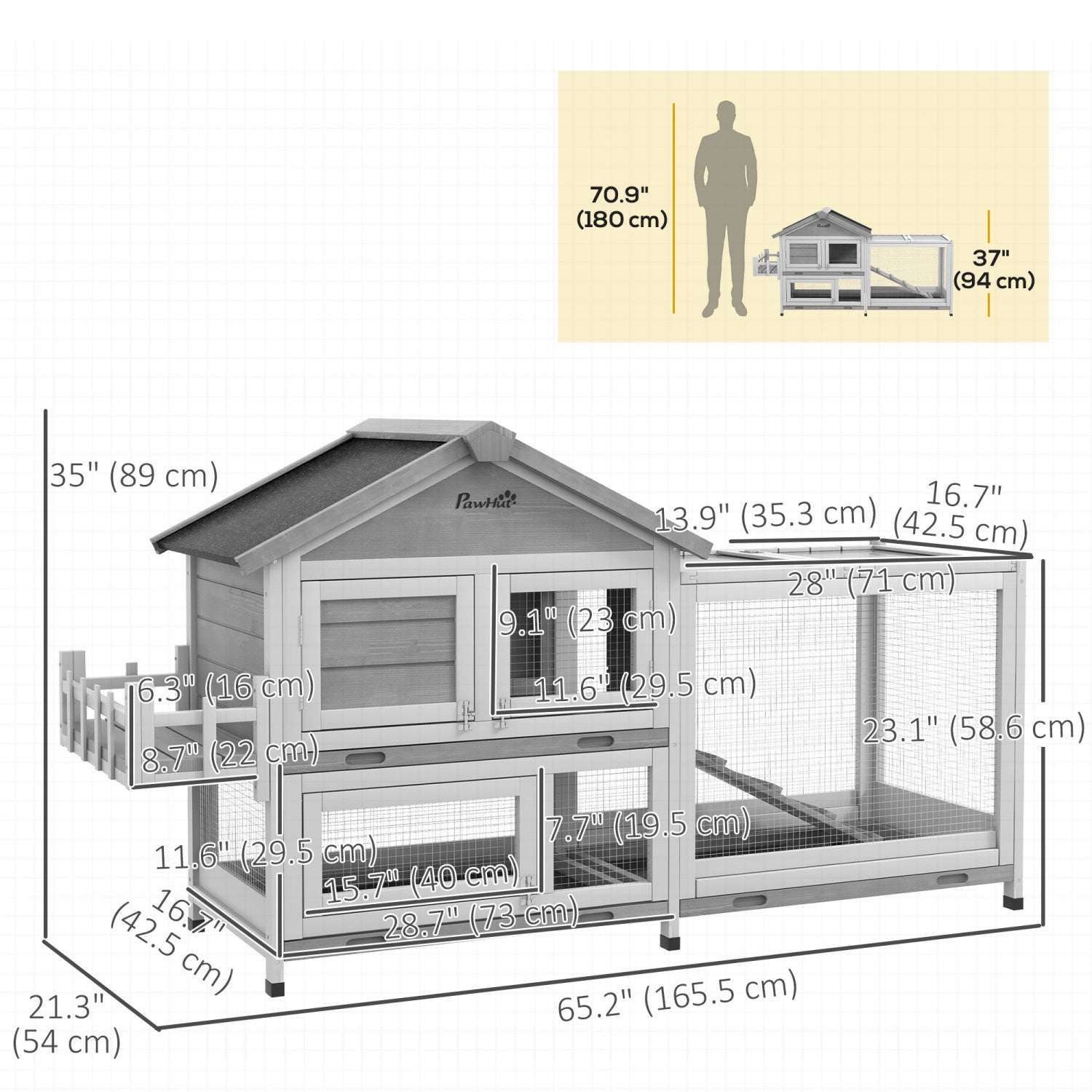 Pawhut 65" Wooden Rabbit Hutch, Pet Playpen With Openable Roof, Bunny House Enclosure With Storage Box, Ramp, Slide-out Tray, For Rabbits And Small Animals - Grey