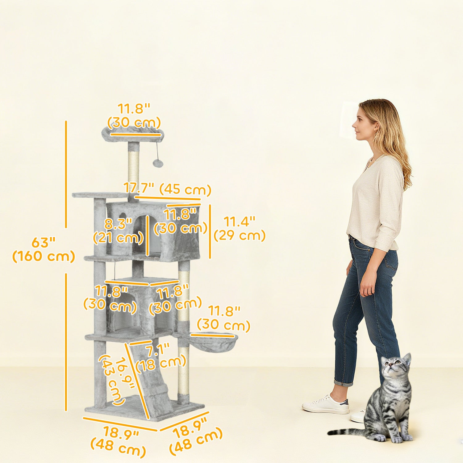 PawHut Cat Tree, 63 Inch Multi-Level Large Cat Tower with Sisal Scratching Posts, Condos, Plush Perches, Hammock, Ladder, Dangling Balls, for Indoor Kittens, Light Grey