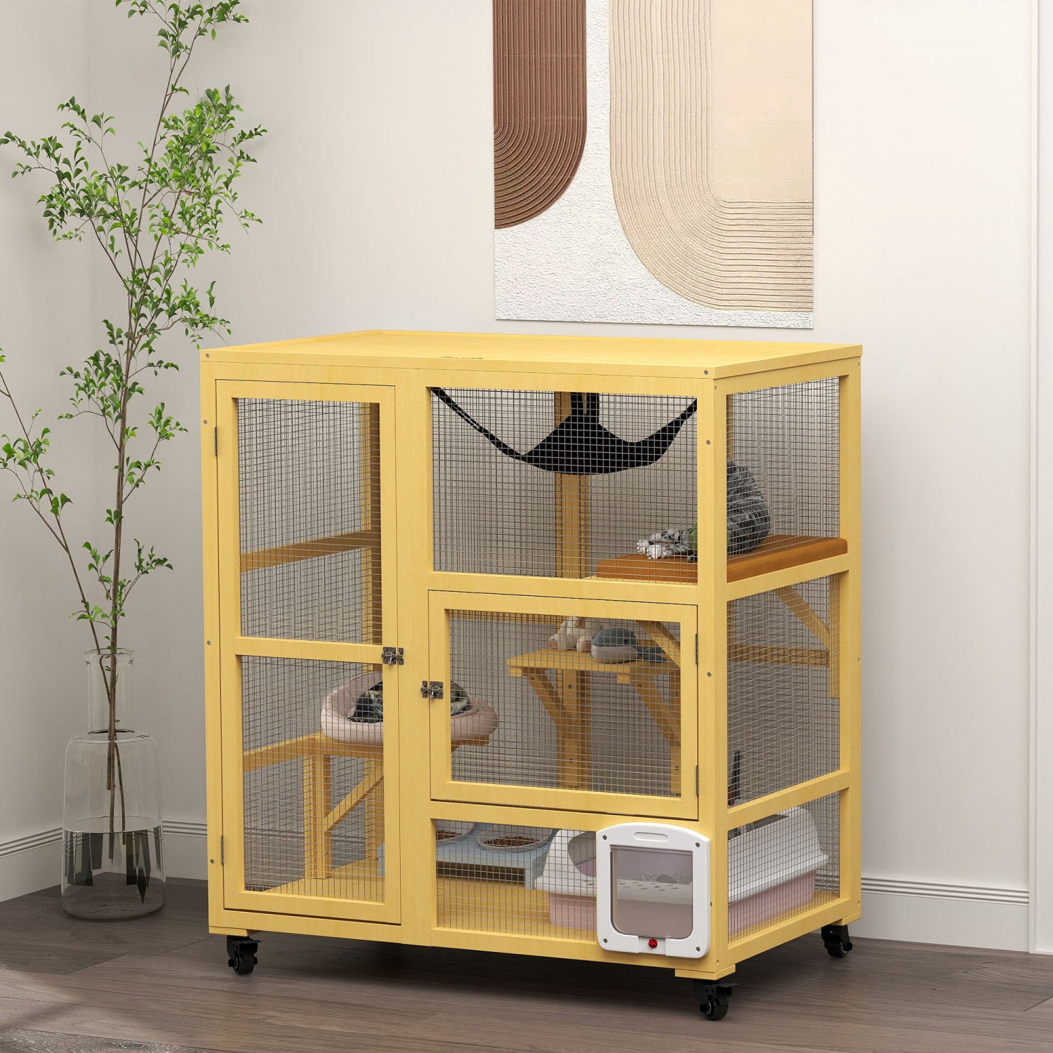 Pawhut Wooden Cat House For Indoor 3 Levels Cat Condo Villa On Wheels With Flap Door Platforms Hammock Openable Top For 2 Kittens, Yellow