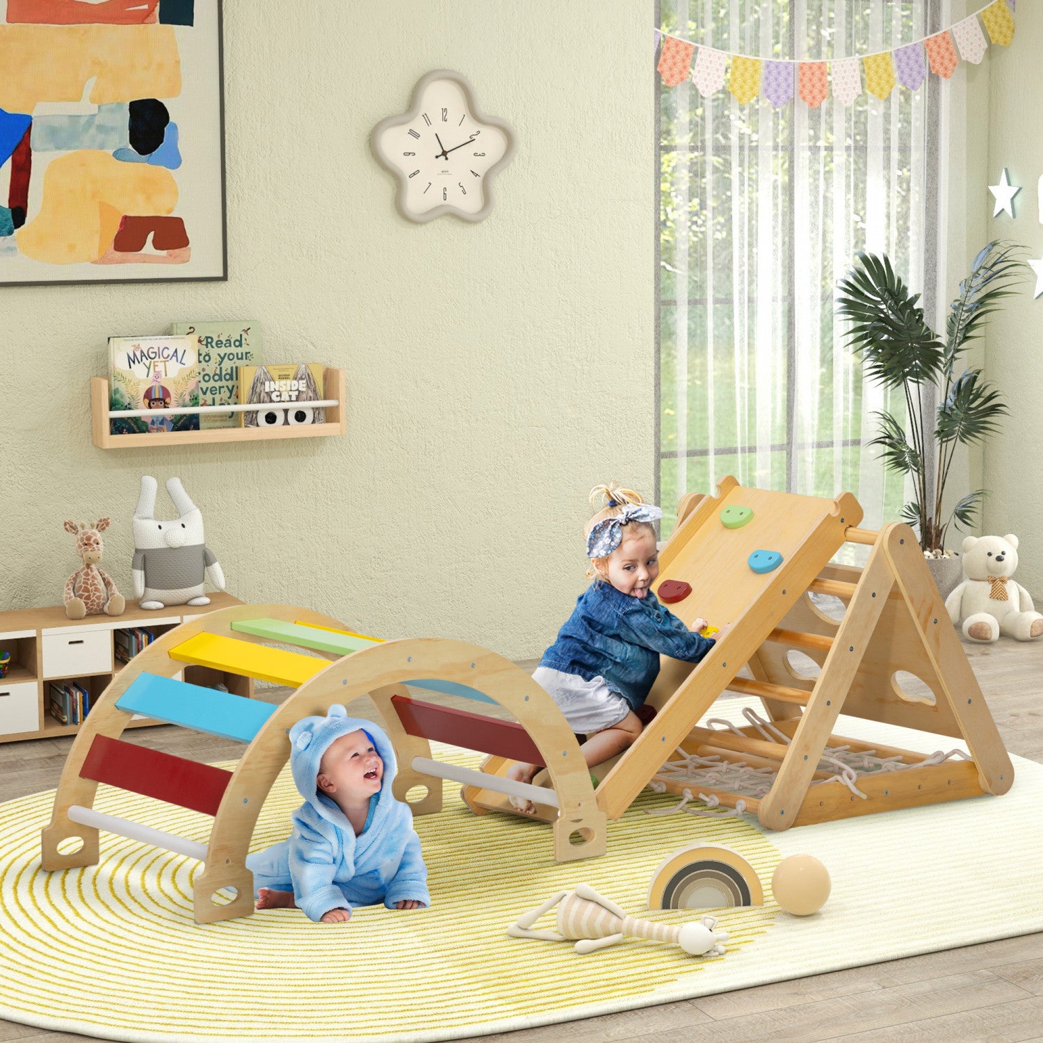 Qaba Pikler Triangle Set, 7 In 1 Climbing Toys For Toddlers Indoor, Montessori Climbing Set, Wooden Jungle Gym For Kids, With Ramp, Arch Ladder, For 18-48 Months, Multicolour