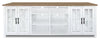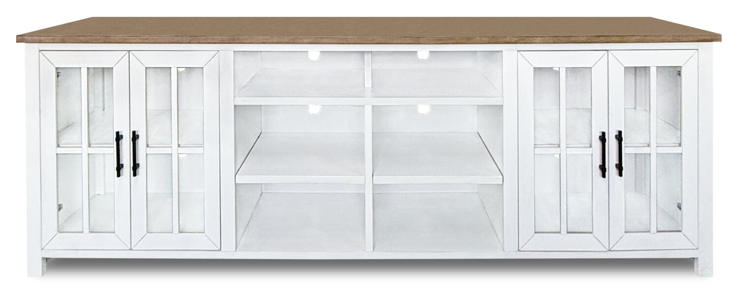 Create a bright and welcoming space with the Sterling 95.83-inch TV stand. A clean white finish paired with a natural wood-grain top brings a fresh, modern feel to your room. Ten shelves provide space to store your sound system, PVR or DVD players as well as books and decor. Two glass door cabinets let you display your favourite items while keeping them protected from dust and debris. With a spacious top for TVs up to 100 inches and built-in cable management, the Sterling keeps your setup neat and ready for movie nights at home.