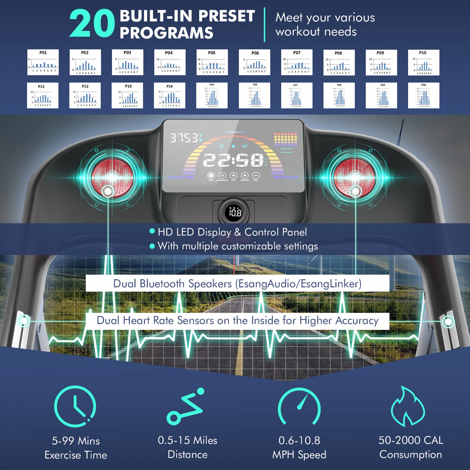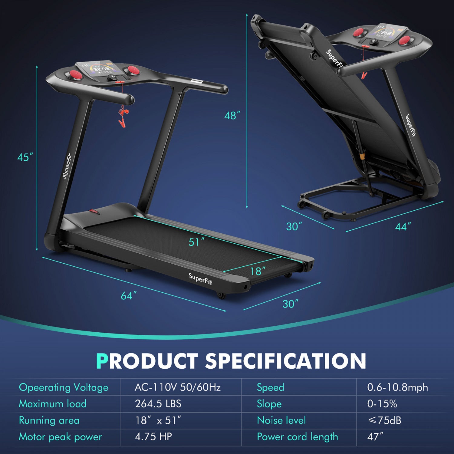 Superfit 4.75hp Folding Treadmill W/preset Programs Touch Screen Voice/app/remote Control