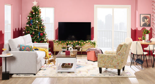 A cheerful pink living room that blends festive decor and eclectic furniture for a cozy, inviting vibe.