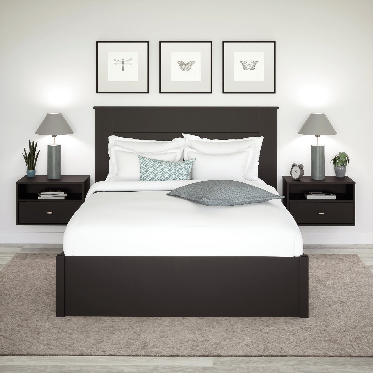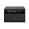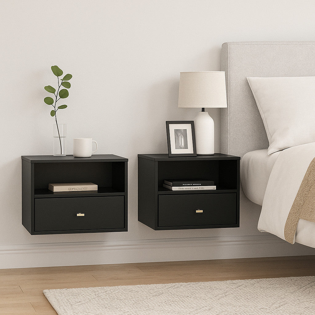 The prepac floating nightstand combines sleek design with space-saving functionality, making it an essential addition to your modern bedroom. Measuring 15"d x 22. 5"w x 14. 5"h, this floating nightstand in black features both a drawer and an open compartment, providing ample storage for bedside essentials like books, glasses, or electronic devices. With integrated openings for cord management on the top surface and within the compartment, this floating nightstand with drawer ensures a tidy and organized space. Its wall mounted nightstand design allows for flexible placement at any height, freeing up valuable floor space while maintaining a clean and contemporary aesthetic. Easy to install using prepac’s innovative mounting rail system, this wall mounted bedside table only requires locating the wall studs for a secure fit. Constructed from non-toxic, carb-2 compliant, laminated composite woods, it meets all north american safety standards, ensuring durability and environmental responsibility. This versatile floating side table doubles as a floating bedside shelf or a wall hanging bedside table, seamlessly blending into any decor style. Perfect for compact spaces, it serves as a practical solution for those seeking floating nightstands for bedroom use, offering a streamlined design that maximizes functionality. The sleek black finish complements both modern and contemporary interiors, making it a standout wall mounted bedside cabinet or a chic floating bedside table shelf. Its thoughtful construction supports the organization of personal items, while the smooth-gliding drawer ensures easy access to frequently used belongings. Manufactured in the usa and canada, this wall nightstand comes with a 5-year limited warranty, offering peace of mind and long-lasting quality. Whether you're upgrading your bedroom with a wall hanging nightstand or enhancing a cozy reading nook, this wall-mounted design adds elegance and functionality to your living space.