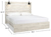 Shine some light on bedtime relaxation with this Abby king bed. Rustic and industrial styles collide in natural-looking wood with a light white finish and dark metal nailheads. Two LED-powered sconce lights built into the headboard provide some extra illumination for when you want to stay up late and read just one more chapter. A pair of USB ports means that you'll never have to worry about your phone dying in the middle of the night again. Three slats with matching support legs make sure you're comfortably supported all night long. Curl up on the Abby tonight, and let some light into your dreams.