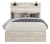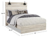 Shine some light on bedtime relaxation with this Abby queen bed. Rustic and industrial styles collide in natural-looking wood with a light white finish and dark metal nailheads. Two LED-powered sconce lights built into the headboard provide some extra illumination for when you want to stay up late and read just one more chapter. A pair of USB ports means that you'll never have to worry about your phone dying in the middle of the night again. Three slats with matching support legs make sure you're comfortably supported all night long. Curl up on the Abby tonight, and let some light into your dreams.
