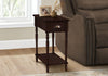 This fashionable and practical 24 inch high accent table is a must-have piece for your home. With a space saving design, this 2 tier side table is perfect for small spaces with its narrow profile to set next to an armchair or sofa in a living room with a small lamp on the beveled top, or as a charming nightstand in the bedroom. The rich cherry brown veneer finish with slim turn post legs adds a touch of traditional elegance to any room, while the storage drawer with a handsome bronze metal pull and bottom shelf allows you to conveniently keep essentials within reach. Durably designed with quality materials to withstand everyday use with an easy to clean top, this end table is backed by a 5 year limited warranty against manufacturer's defects for your convenience. Quick and easy to assemble with illustrated instructions included so you can have this versatile accent table setup and ready to enjoy in no time!