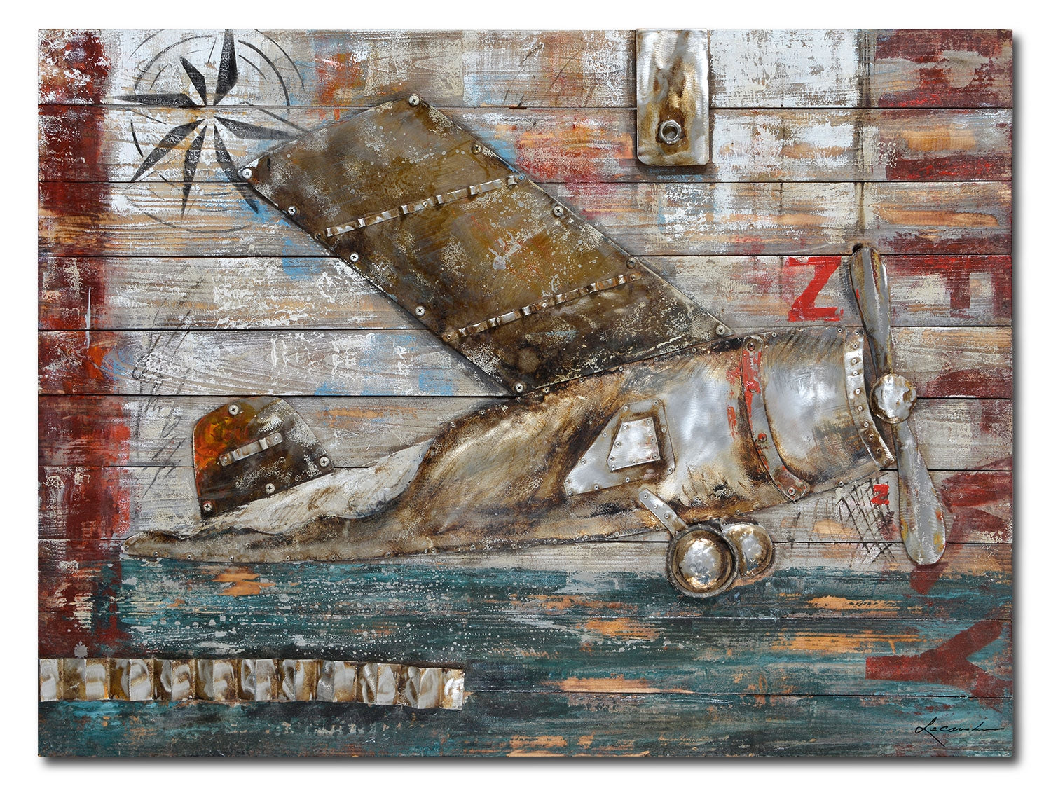 Metal accents bring this vintage aircraft to life. Hand-painted by Lecavalier on wood with burnt edges, this work of art is the epitome of rustic. Hues of red, blue, brown and ivory make this a beautiful addition to your home.