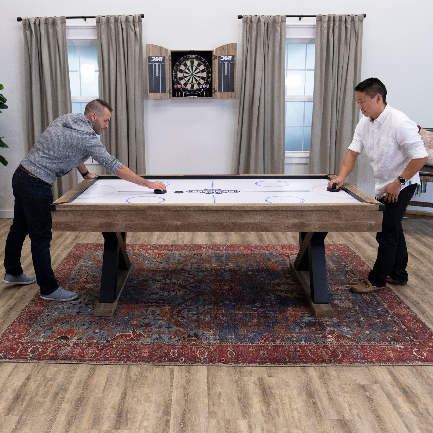 Add some fun and flair to your home without making it look like your local arcade. The Kirkwood 84" Air Powered Hockey Table features a beautiful, rustic wood finish paired with unique k-shaped legs, giving its classic design a modern twist that will look stunning in any home. Despite the table's stylish exterior, its dimensions provide the same authentic arcade game play you know and love. It's inlay electronic scoring features in-game sound effects while keeping track of goals for even more excitement. The Kirkwood's large, 110V 60HZ blower motor provides strong airflow for fast-paced game play while the built-in control panel provides quick and easy game set up. This table hockey game has everything you need to start playing, just grab the two pucks and two pushers and get ready for hours of fun.