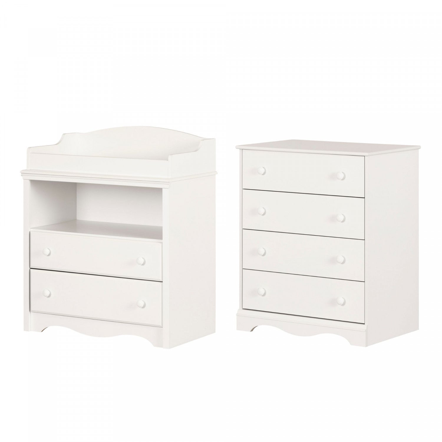 A stylish duo for the nursery. This essential nursery set includes a changing table and a chest. With their curved cutouts and attractive wooden knob-style handles, these pieces won’t be short on style. The front panel and rounded corners make the fixed rim on the changing table safe. The traditional look of this piece will work nicely with a unisex nursery decor. To add a touch of personality, put some family photos on top of the chest, and some original baskets in the open space of the changing table. Ample storage with so much storage in these two pieces, you’ll have a well-organized diaper changing station. The four roomy drawers in the chest can hold a lot of clothes. The changing table has two drawers and an open compartment – ideal for diapers, wipes, and lotions. Baby will be clean and oh-so-cute in no time at all!
