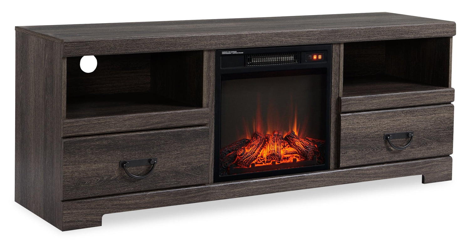 Fill your living room with style and warmth with this Asher electric fireplace TV stand. Two deep cubby spaces help keep your media consoles safe along with back cutouts to help keep cords organized. Meanwhile, two drawers provide plenty of space for remote controls, cords and batteries. Great for heating small spaces, the 18-inch insert offers three flame brightness levels to get the mood just right. Settle into cozy comfort with this stately Asher TV stand.