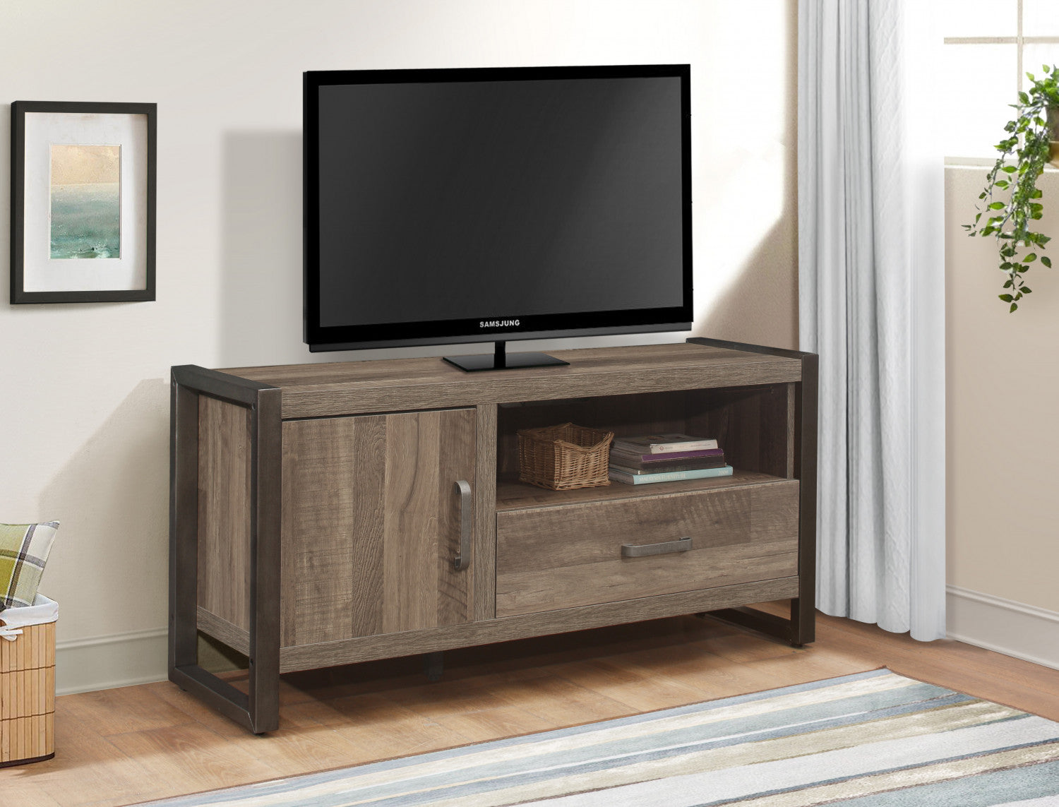 The contemporary styling of the on-trend Bassett 51" TV Stand features a handsome two-tone mixed-media finish. The gunmetal accenting on the stand's metal framing provides a distinct contrast to the printed brown faux wood grain melamine veneer. The premium melamine laminate is not only scratch and stain resistant but is also a breeze to clean. Providing plenty of storage for your media accessories, including a storage cubby, a side cabinet with an adjustable shelf, and a drawer with roller side glides, this modern TV stand brings style to your living room while minimizing clutter.