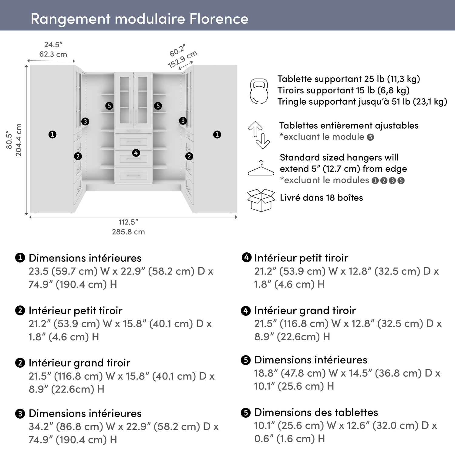This Product Includes | 25 W x 16 D Closet System Tower with Shelves, 2 Doors, and 4 Drawers, 25 W x 25 D Closet System Tower with Shelves, 2 Doors, and 4 Drawers (2), 36 W x 25 D Double Hanging Closet System Tower (2) and 20 W x 16 D Corner Return Closet System with Floating Shelves (2). |