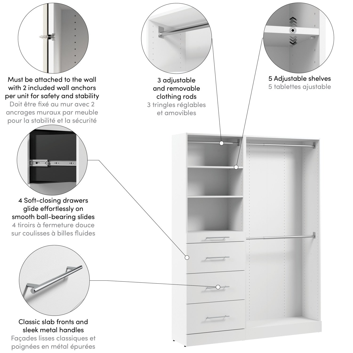 Enjoy the freedom to tailor your closet exactly as you envision it with the Bestar Florence Modular Reach-In or Walk-In Closet System with Rods, Shelves, and Drawers, Slab Style. Imagine creating the space you want, right within the space you have. Space that keeps your belongings organized and easy to find — so your favourite sweater isn’t hiding, but right where you need it. With 5 adjustable shelves, 4 smooth-gliding and soft-closing drawers, and 3 adjustable clothing rods, you can arrange each element to fit your needs — whether you’re maximizing shelf space for folded essentials or adding hanging room for garments. It’s designed to help you add, swap, and rearrange each component to stay ultra-organized as life unfolds. The sleek slab drawer fronts and modern metal handles add a timeless, stylish touch to your closet. Crafted from eco-conscious materials, this system embodies Bestar’s dedication to sustainability and quality.
