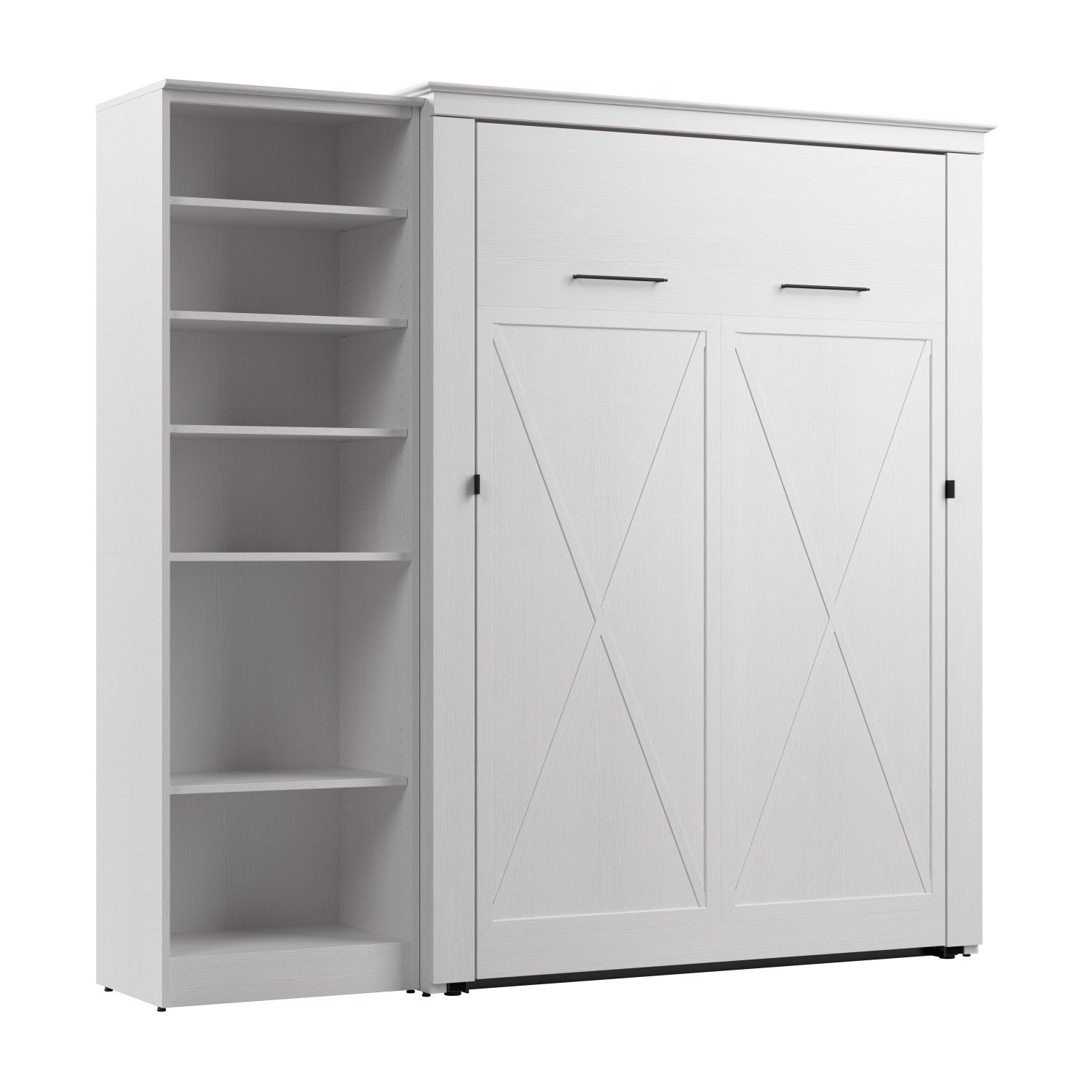 The Bestar Key West Full Murphy Bed with Closet Organizer (88W) is the ideal space saver for a multipurpose room. Unique X pattern accents paired with Antique Bronze hardware create a relaxed and airy style that works well with coastal and farmhouse decor. The Full Murphy bed folds up and down smoothly and quickly thanks to the dual piston system. Choose your own mattress since the bed accommodates most standard Full mattresses (8-10 inches thick, 60-90 lb, 54 x 75 inches) and supports up to 1000 lb (including mattress). The open bed extends 88.2 inches from the wall. Allow a clearance of 30-36 inches around the open bed. The dual-mount wall bed mechanism attaches to the floor and wall for ease of assembly and maximum stability and durability. Take advantage of the tall cabinet’s fixed and adjustable shelves to organize items of various sizes. To avoid risk of injury, the Murphy bed must be installed to wall and floor structure by a professional or qualified person. Two people are required for assembly. Installation requires attachment to wood studs or masonry, removal of the baseboard, and drilling into the floor (if disassembly is required, holes may be covered with baseboards 0.5 inches or thicker). All necessary hardware is included. The cabinet must be anchored to a wall with a minimum ceiling height of 87 inches. Do not use this product for children or pets under 50 pounds (22.7 kg). The Murphy Bed is backed by the Bestar 10 Year Manufacturer’s Warranty.