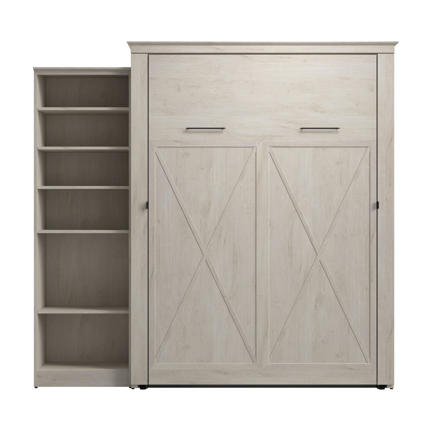 The Bestar Key West Queen Murphy Bed with Closet Organizer (94W) is the ideal space saver for a multipurpose room. Unique X pattern accents paired with Antique Bronze hardware create a relaxed and airy style that works well with coastal and farmhouse decor. The Queen Murphy bed folds up and down smoothly and quickly thanks to the dual piston system. Choose your own mattress since the bed accommodates most standard Queen mattresses (8-12 inches thick, 60-90 lb, 60 x 80 inches) and supports up to 1000 lb (including mattress). The open bed extends 92.9 inches from the wall. Allow a clearance of 30-36 inches around the open bed. The dual-mount wall bed mechanism attaches to the floor and wall for ease of assembly and maximum stability and durability. Take advantage of the tall cabinet’s fixed and adjustable shelves to organize items of various sizes. To avoid risk of injury, the Murphy bed must be installed to wall and floor structure by a professional or qualified person. Two people are required for assembly. Installation requires attachment to wood studs or masonry, removal of the baseboard, and drilling into the floor (if disassembly is required, holes may be covered with baseboards 0.5 inches or thicker). All necessary hardware is included. The cabinet must be anchored to a wall with a minimum ceiling height of 92.1 inches. Do not use this product for children or pets under 50 pounds (22.7 kg). The Murphy Bed is backed by the Bestar 10 Year Manufacturer’s Warranty.