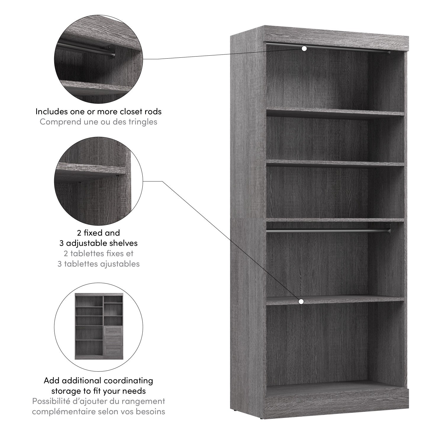 The Bestar Pur 36W Closet Organizer allows you to neatly store your clothes and accessories. Get your home in order with two clothing rods for hanging all of your nicest dresses, shirts, jackets, or dress pants. Customize your closet storage as you please with two fixed shelves and three adjustable/removable shelves made help you organize clothing, bags, shoes, and other items of varying sizes. This wardrobe storage is a great solution for a walk-in closet, a bedroom, an entryway, or a laundry room. It makes a great linen cabinet, and the clothing rods can be used to hang clothes to dry. Designed for use as a standalone closet organizer or as part of a larger configuration when paired with coordinating items from the Pur Collection (sold separately), this storage cabinet provides ample opportunities for keeping your home in order without overwhelming your floor space. Add a Pur 3 Drawer Set or 2 Door Set (sold separately) for a mix of open and concealed storage. This closet organizer is backed by the Bestar 10 Year Manufacturer’s Warranty. North American made with globally sourced materials.