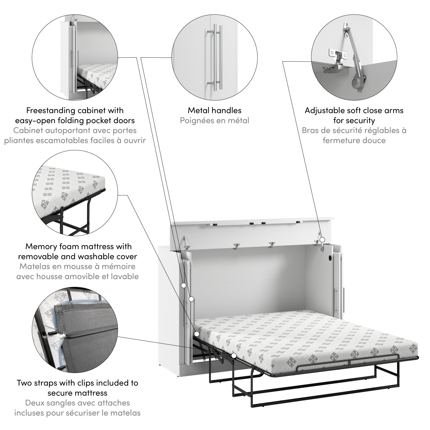 The Bestar Pur full cabinet bed is perfect for a multipurpose guest room. When the cabinet is closed, you have a beautiful sideboard that blends into your space. When the cabinet is open, it reveals a cozy pull-out bed. The included full folding foam mattress provides comfort to anyone using the bed for a good night’s sleep. The cabinet comes with metal handles to create a sleek look that beautifully complements various home decor styles. The cabinet doors’ shaker-inspired trim also adds a touch of style. The top of the sideboard can be used to place decorative items. You can add a convenient guest bed to your living room, your home office or even your dining room thanks to this ingenious space-saving solution.