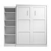 The Bestar Pur Queen Murphy Bed with Shelving Unit (90W) is the ideal space saver for a multipurpose room. The mattress support uses flexible slats that follow the curves of the body and absorb pressure for maximum comfort. The Queen Murphy bed can be used every night for a good night’s sleep. The bed folds up and down smoothly thanks to the dual piston system. The wall bed accommodates most standard Queen mattresses (8-12 inches thick, 60-90 lb, 60 x 80 inches) and supports up to 1000 lb (including mattress). The open bed extends 92 inches from the wall. The cabinet must be anchored to a wall with a minimum ceiling height of 91. 1 inches. Allow a clearance of 30-36 inches around the open bed. The shelving unit comes with 2 fixed and 3 adjustable shelves to hold your personal items. The dual-mount wall bed mechanism attaches to the floor and wall for maximum stability and durability. To avoid risk of injury, the Murphy bed must be installed to wall and floor structure by a professional or qualified person. Two people are required for assembly. Installation requires attachment to wood studs or masonry, removal of the baseboard, and drilling into the floor (if disassembly is required, holes may be covered with baseboards 0. 5 inches or thicker). All necessary hardware is included. Do not use this product for children or pets under 50 pounds (22. 7 kg). This bundle is backed by the Bestar 10 Year Manufacturer’s Warranty. North American made with globally sourced materials.