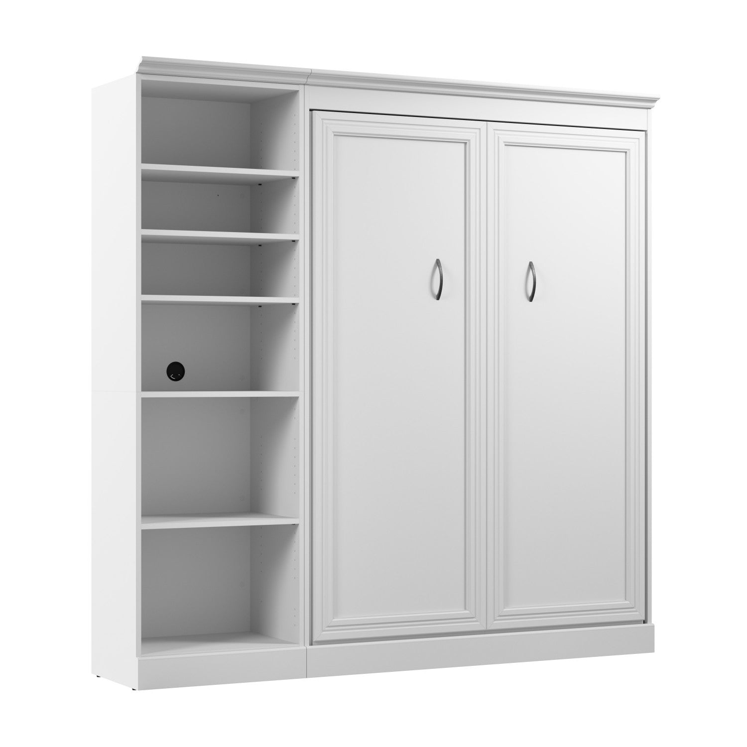 The Bestar Versatile Full Murphy Bed and Closet Organizer (84W) is the ideal space saver for a multipurpose room. The mattress support uses flexible slats that follow the curves of the body and absorb pressure for maximum comfort. The Full Murphy bed folds up and down smoothly thanks to the dual piston system. The wall bed can be used every night for a good night’s sleep. The bed accommodates most standard Full mattresses (8-10 inches thick, 60-90 lb, 54 x 75 inches) and supports up to 1000 lb (including mattress). The open bed extends 84. 9 inches from the wall. The cabinet must be anchored to a wall with a minimum ceiling height of 88. 8 inches. Allow a clearance of 30-36 inches around the open bed. Closet organizer comes with 2 fixed and 4 adjustable shelves to store your belongings. The dual-mount wall bed mechanism attaches to the floor and wall for maximum stability and durability. To avoid risk of injury, the Murphy bed must be installed to wall and floor structure by a professional or qualified person. Two people are required for assembly. Installation requires attachment to wood studs or masonry, removal of the baseboard, and drilling into the floor (if disassembly is required, holes may be covered with baseboards 0. 5 inches or thicker). All necessary hardware is included. Do not use this product for children or pets under 50 pounds (22. 7 kg). Backed by the Bestar 10 Year Manufacturer’s Warranty. North American made with globally sourced materials.