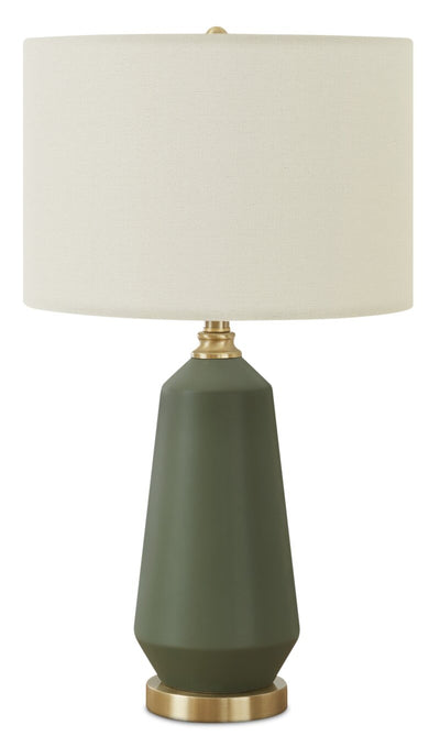 Brighten up your home with this contemporary and stylish 26"h table lamp. Featuring a unique retro-inspired green ceramic base with gold metal accents and an ivory linen fabric shade, this lamp is perfect to place on any side or end table, nightstand, or bedside table. The 3-way switch with a single bulb outage of 100W/120V (not included), allows you to choose the right amount of light and ambiance in an office, living room, or bedroom space. Made with quality materials, this lamp includes a 2-year limited warranty against any manufacturer's defects for a worry-free purchase.