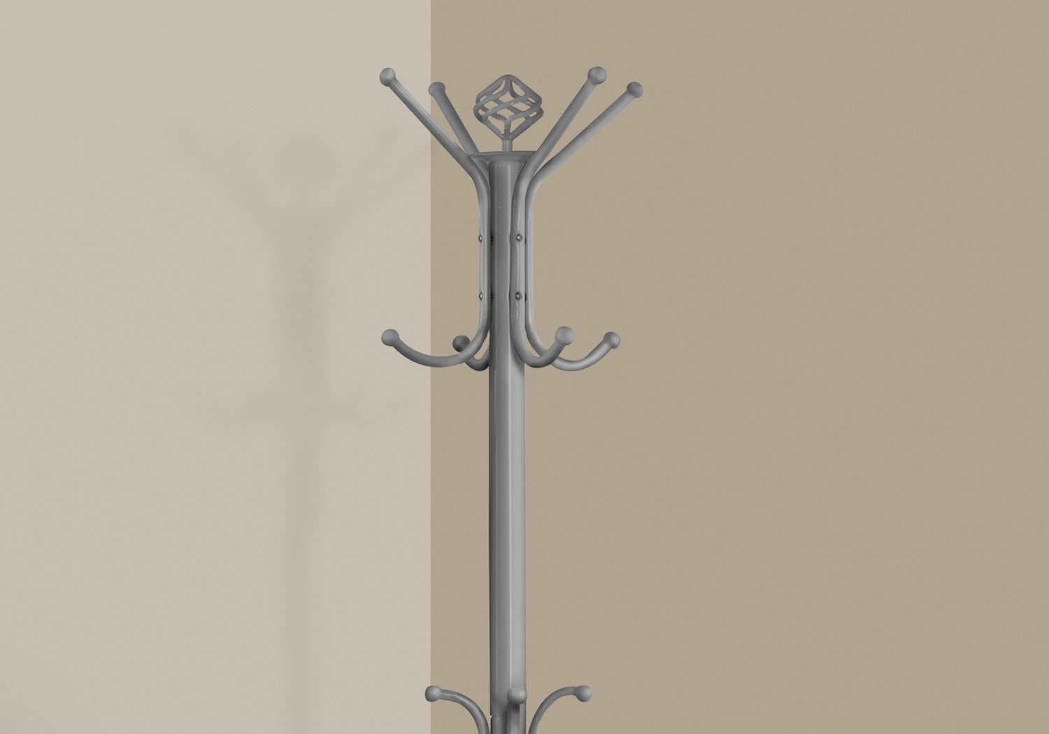Freely hang your hats, scarves and jackets on this practical coat tree finished in a trendy silver metal. Natural and smooth, the coat rack's wide base will help evenly distribute the weight of all your apparel so you don't have to worry about tipping. Ideal in offices, entrances, bedrooms or more, the versatility of this standing coat rack is endless featuring 12 hooks on a double tier format. Your ideal coat rack in small spaces, this model is perfect in the entrance, bedroom or office.