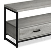 Enjoy the two-tier spaciousness of this Corban TV stand. The roomy stand top with thick-panel construction accommodates most TVs up to 55 inches. Below, the open-concept shelf provides ample room for audio-visual components and easy cable management, while the two drawers can store remotes, game controllers or entertainment accessories. This piece is supported by a sleek black metal frame that provides a modern look. With its space-saving design, this media console is a great choice for an apartment, condo or small home.