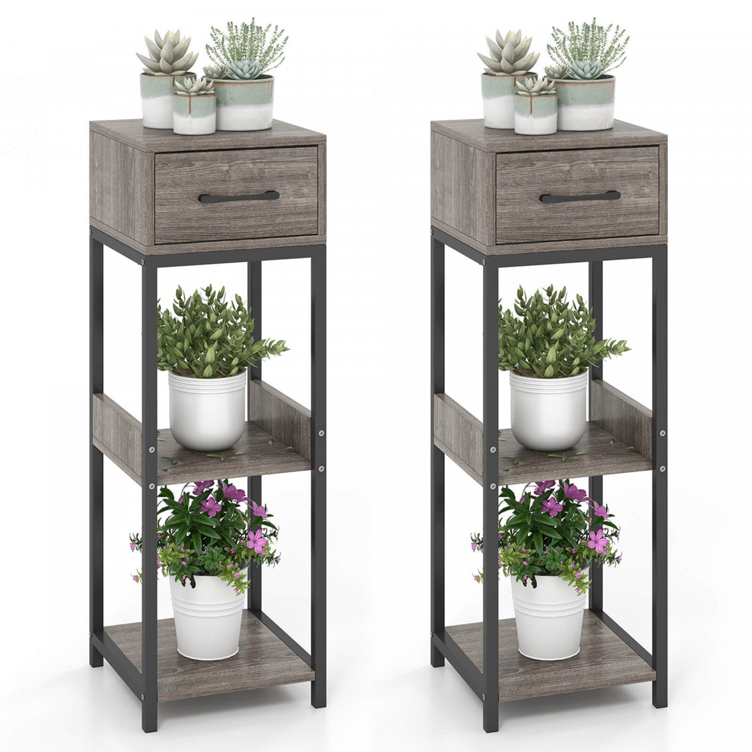Costway 2 Pack 3 Tier Indoor Tall Plant Stand With Drawer Anti-tipping Devices Display Shelf
