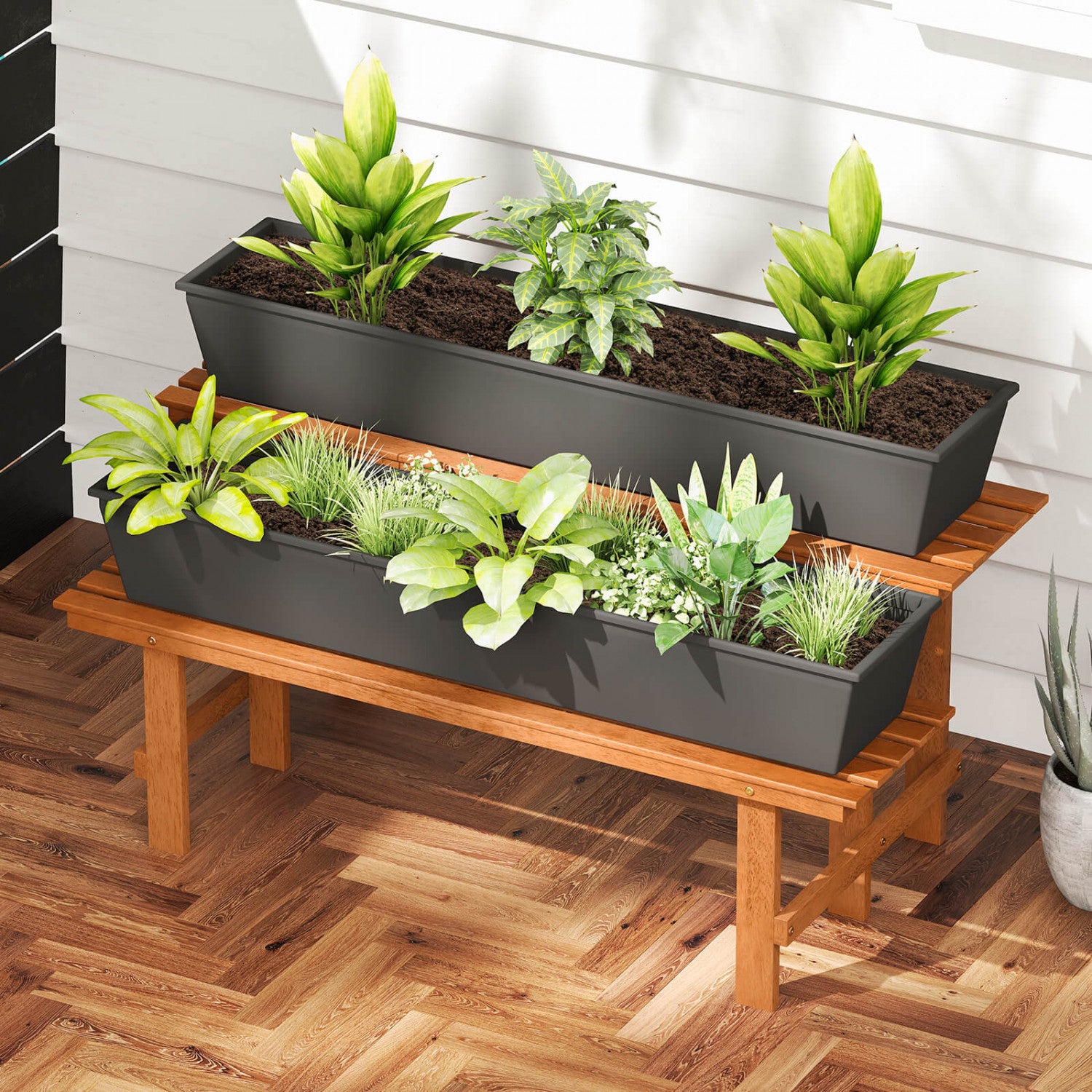Costway 2 Tier Wood Plant Stand With Teak Oil Finish Indoor & Outdoor Flower Pot Holder