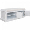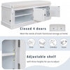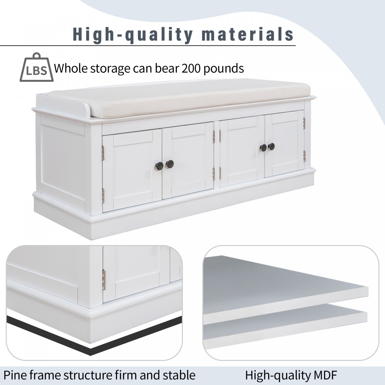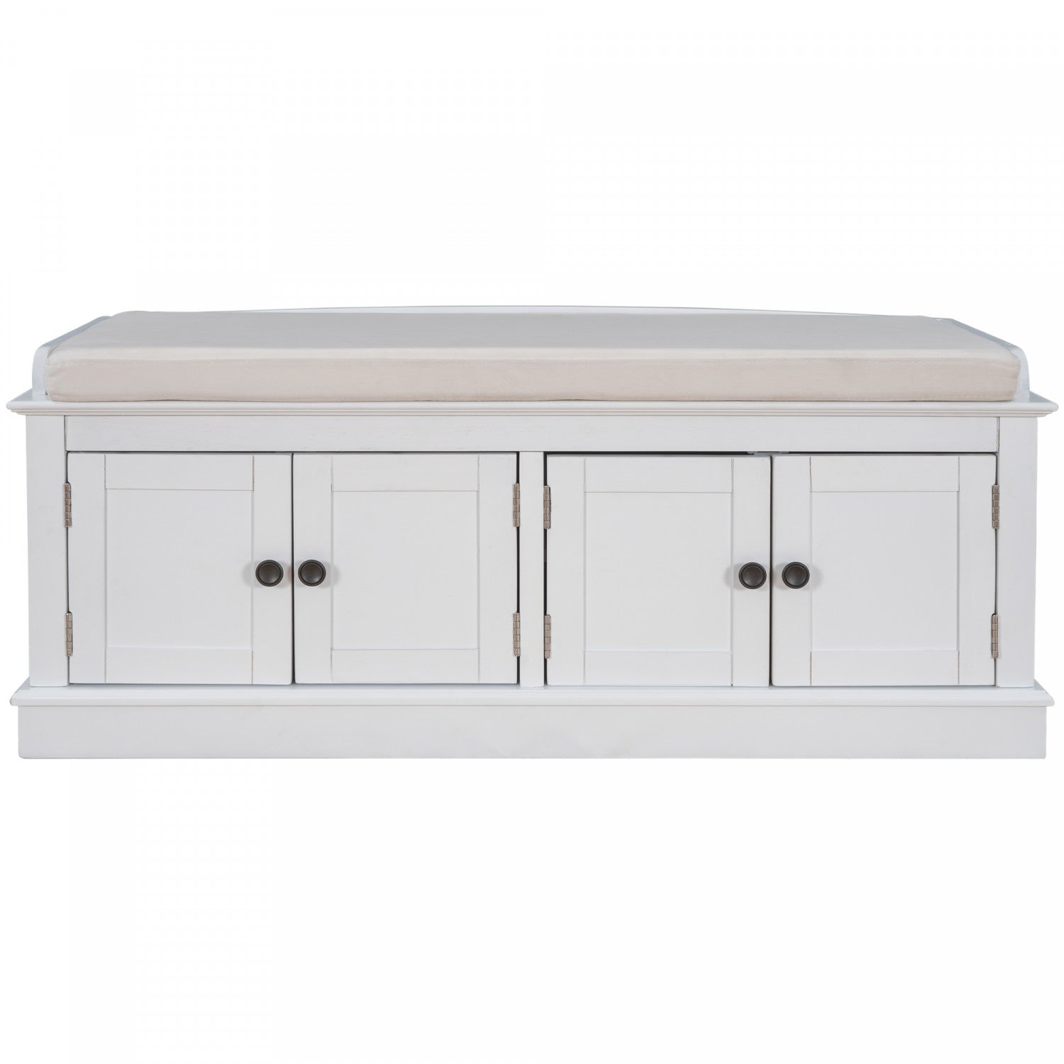 Organize your entryway with the storage bench. Featuring four doors with adjustable interior shelves, this bench combines style and practicality. A removable 2. 2-inch cushion offers added comfort, while the solid wood and mdf construction ensures lasting durability. Round handles and magnetic door closures provide easy access to everyday essentials. Ideal for hallways, mudrooms, or living rooms, this bench helps keep your home tidy and stylish. Easy to assemble with all tools included.