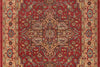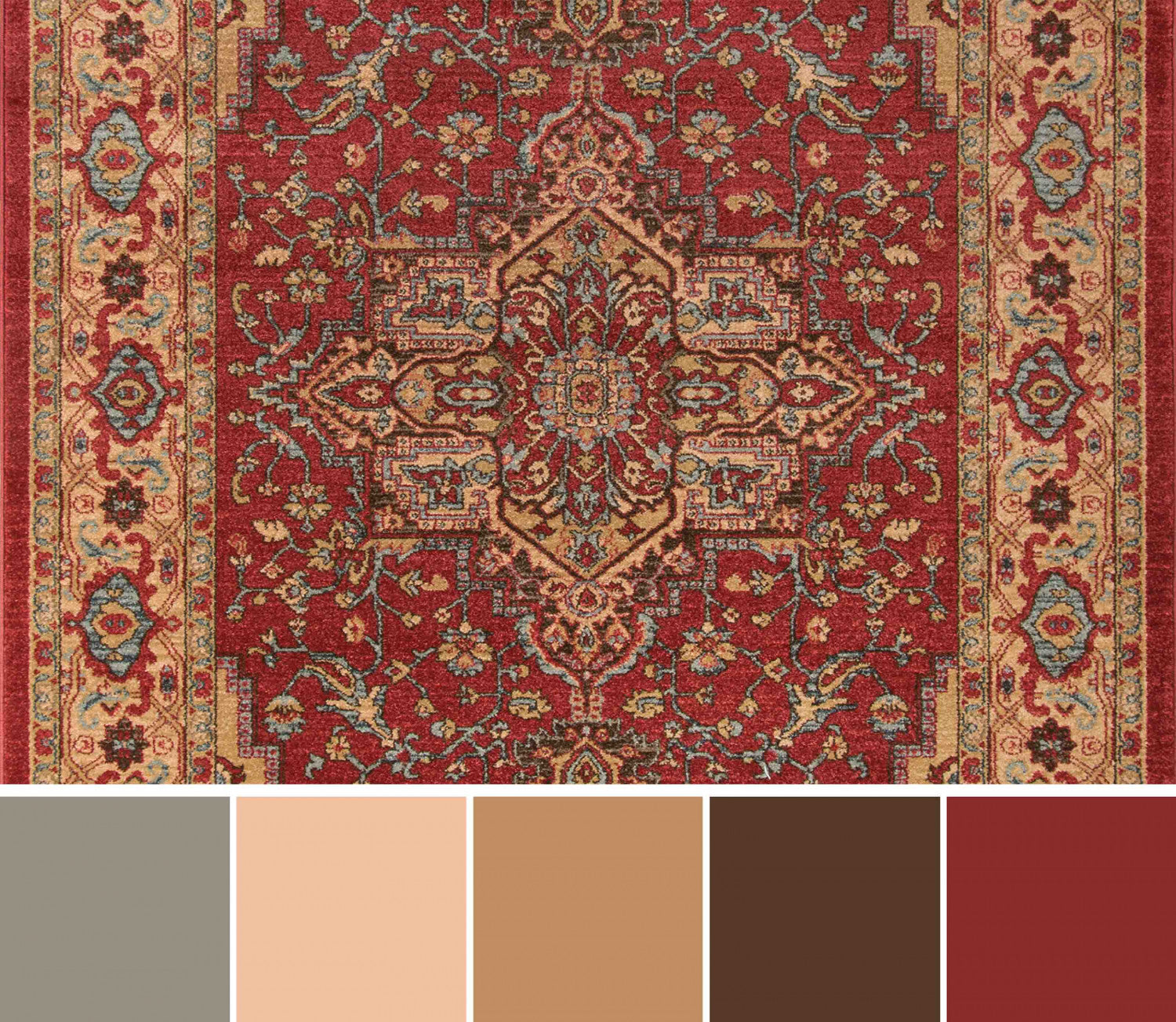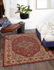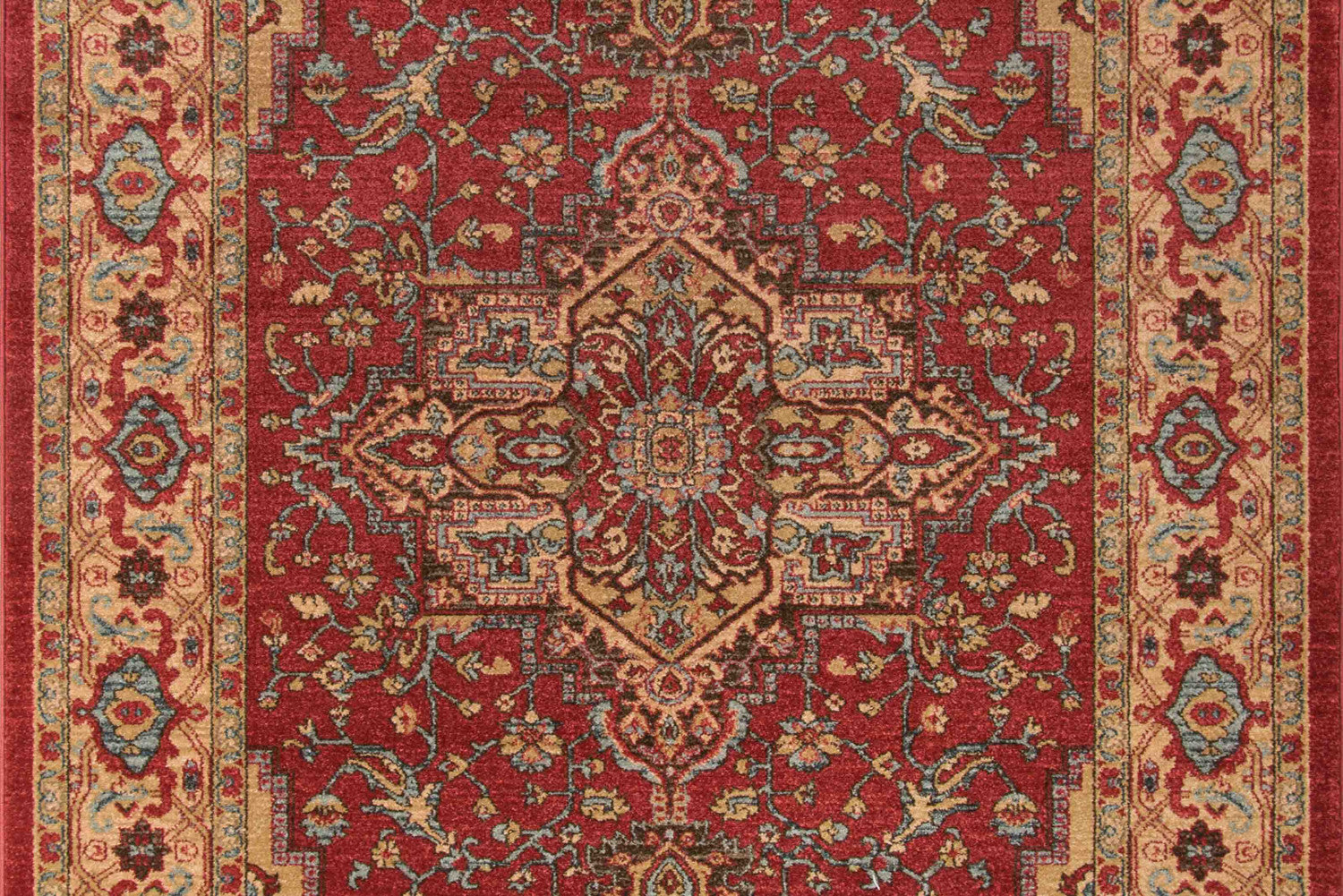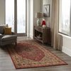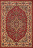 The ornamental elegance of this traditional area rug has deep roots in old world design motifs. Evoking the timeless visual elements inspired by classic Kazak carpets, an eye-catching geometric field of medallions, palmettes and flowers is surrounded by an intricate border in regal shades of crimson red, blue and gold. With references to centuries-old Heriz and Serapi rug patterns, each elaborate rug design is elegantly crafted from soft synthetic fibers, while power-loomed precision ensures this traditional floorcovering will truly stand the test of time.