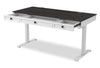 Experience ultimate convenience and efficiency in your office with this Elevate height-adjustable desk. This sleek and modern desk offers wireless charging and multiple USB ports, keeping you fully charged throughout the day. Its three drawers let you keep your office essentials close at hand, while the middle drawer can flip down to become a keyboard tray. Plus, the power lift levelling system ensures a seamless transition between sitting and standing. The dark grey handles and five-piece drawer fronts add an elegant touch to this versatile desk. Increase productivity and streamline your workspace with the Elevate.