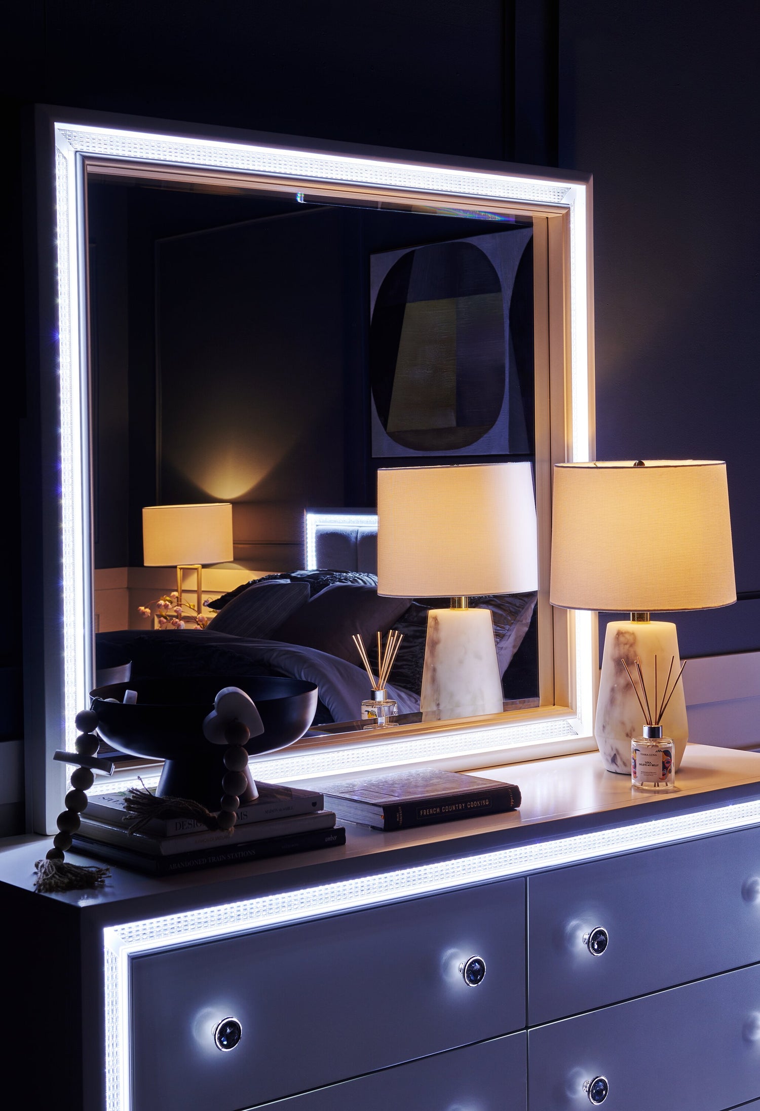 Halo 6pc Bedroom Set with Bed, Dresser, Mirror & Nightstand, LED, Glam, White - King Size
