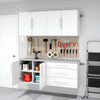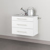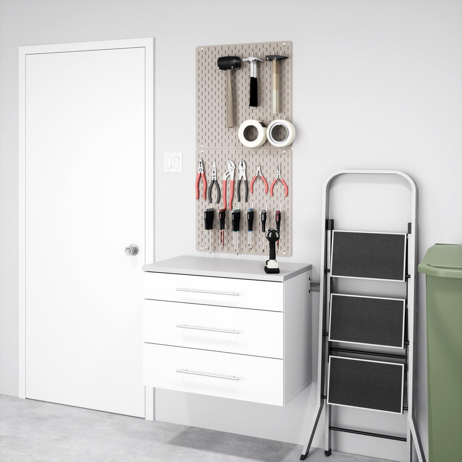The HangUps 3 Drawer Base Cabinet offers versatility for your ever changing storage needs in the garage, laundry room, office or workshop. This cabinet is constructed using laminated composite wood and features 3 sturdy drawers with 1/2 in. drawer bottoms and metal drawer sides. The Base Cabinet mounts securely to the wall with a heavy duty metal rail and hook system. The wall mounted feature ensures easy cleaning beneath the cabinets and protects your stored items from water and dirt. This product ships ready-to-assemble and includes all hanging rails and fastening bolts. Add other cabinets from our HangUps Collection to create a storage system to convert any cluttered room into an organized space.
