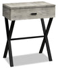 Add this Harper accent table to your room for some funky character with handy utility. The reclaimed wood-look lends a stylish, urban vibe while the creamy grey tone coordinates easily with most home colour palettes. This versatile piece can be used as an end table in the living room, an accent table in the entryway, or as a nightstand in the bedroom. Featuring a storage drawer with a chrome handle, this handsome little unit is ready to be on hand for whatever you need.
