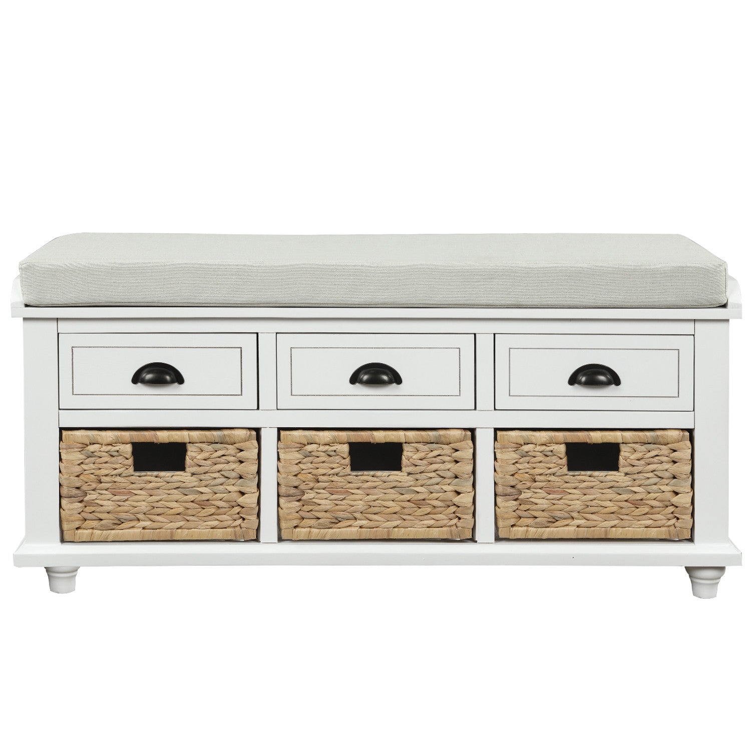 The rustic storage bench combines style and practicality, featuring three drawers and three removable rattan baskets for versatile storage. Crafted from durable acacia wood with woven water hyacinth panels and aluminum alloy drawer pulls, this bench adds charm and function to any entryway or living room. A removable linen blend cushion offers added comfort and is easy to clean. Assembly is simple with step-by-step instructions included.