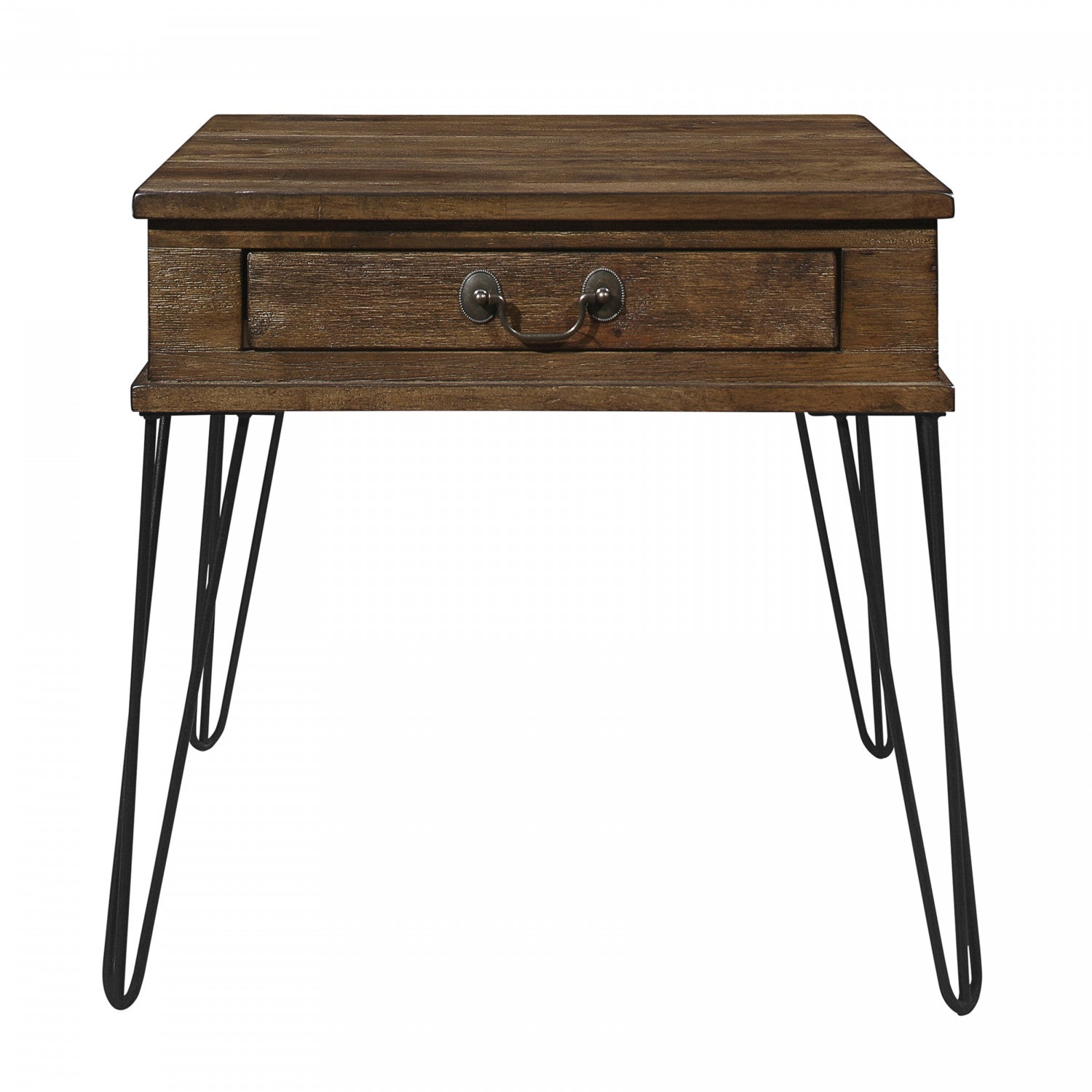 Loaded with antique charm and transitional versatility, the Hughey End Table combines a modern profile and classic accenting to create a novel look for your casual living room. Constructed from solid Asian hardwood with a brown rustic oak finish, this transitional square tabletop stands atop black metal hairpin legs for an eye-catching appearance with a nod to industrial styling. One functional drawer provides useful storage, especially when entertaining - keep all your cocktail napkins, toothpicks, and cutlery within easy reach! Antique bronze-toned drop handle hardware completes the look, allowing this end table to meld the old with the new for a truly unique living room. Other coordinating occasional tables are also available.