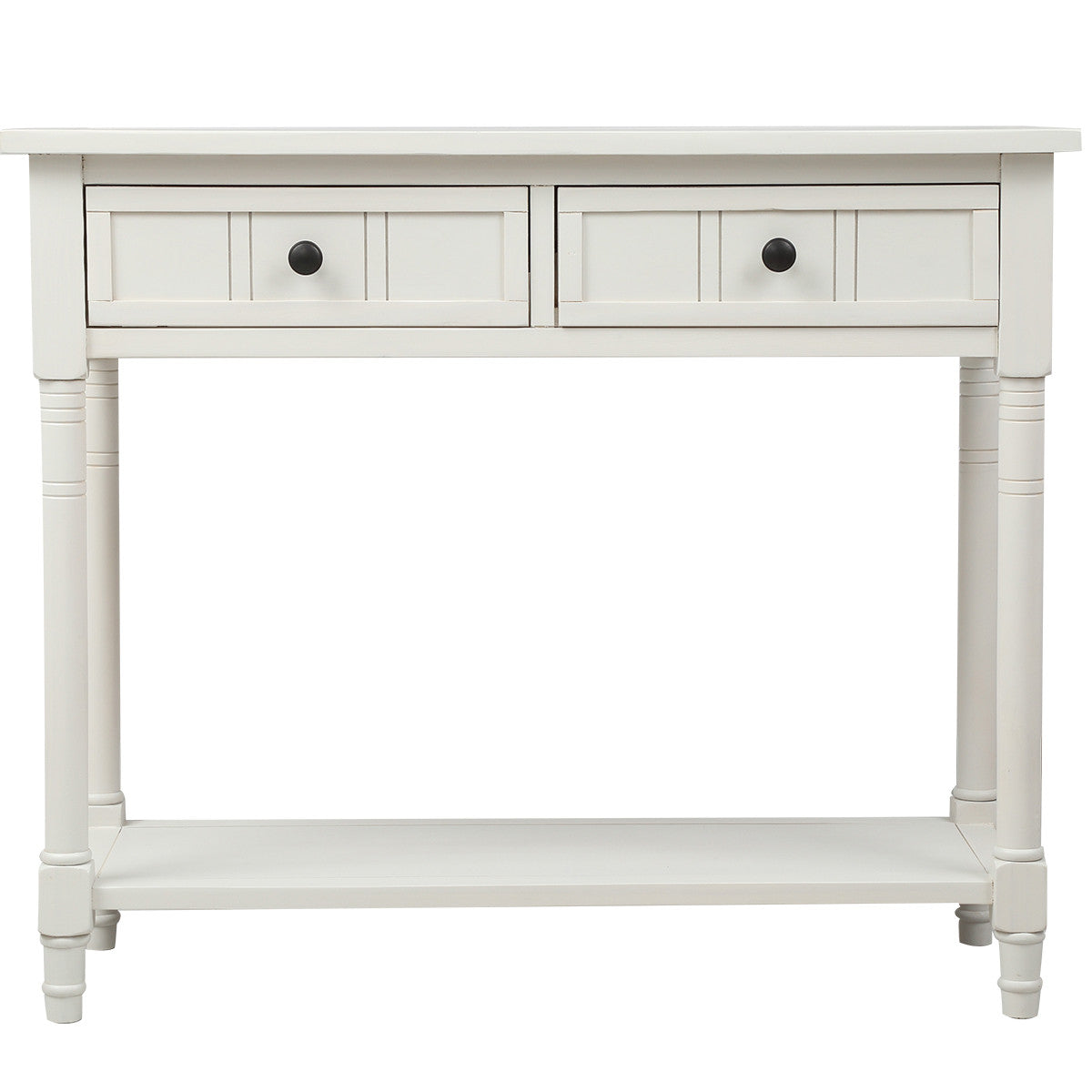 The console table blends traditional charm with practical storage. Its compact size fits perfectly in entryways, living rooms, or dining areas, while two spacious drawers keep essentials neatly tucked away. A solid wood frame with carved detailing and a smooth finish adds vintage appeal. The bottom shelf offers space for books, baskets, or decor. Designed for everyday use, this accent table is both functional and elegant. Assembly is simple—just attach the legs and shelf. A timeless piece for any room in your home.