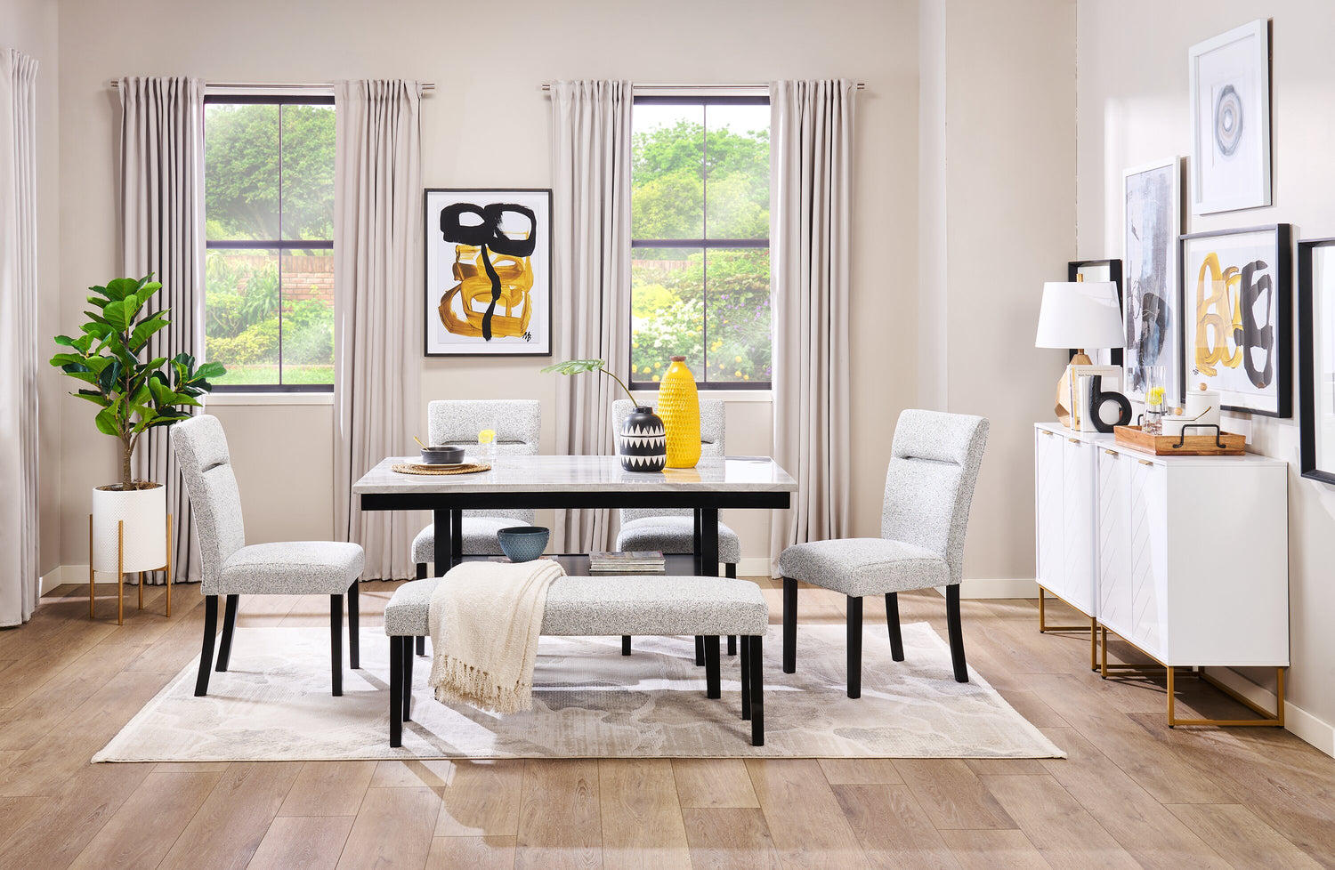Libra Dining Table with Marble-Look Top & Storage Shelf, 60"W- Black/Grey