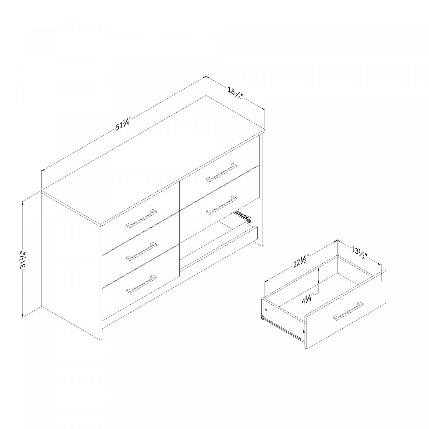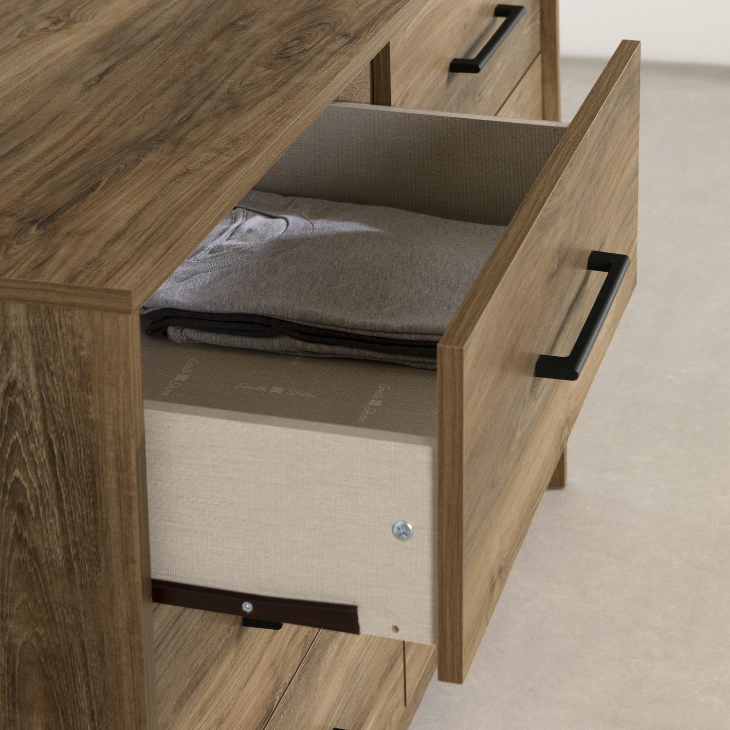 Organize your clothes more easily by sorting them into categories for storage in these six large drawers. Each one is mounted on metal slides and can hold up to 25 pounds.