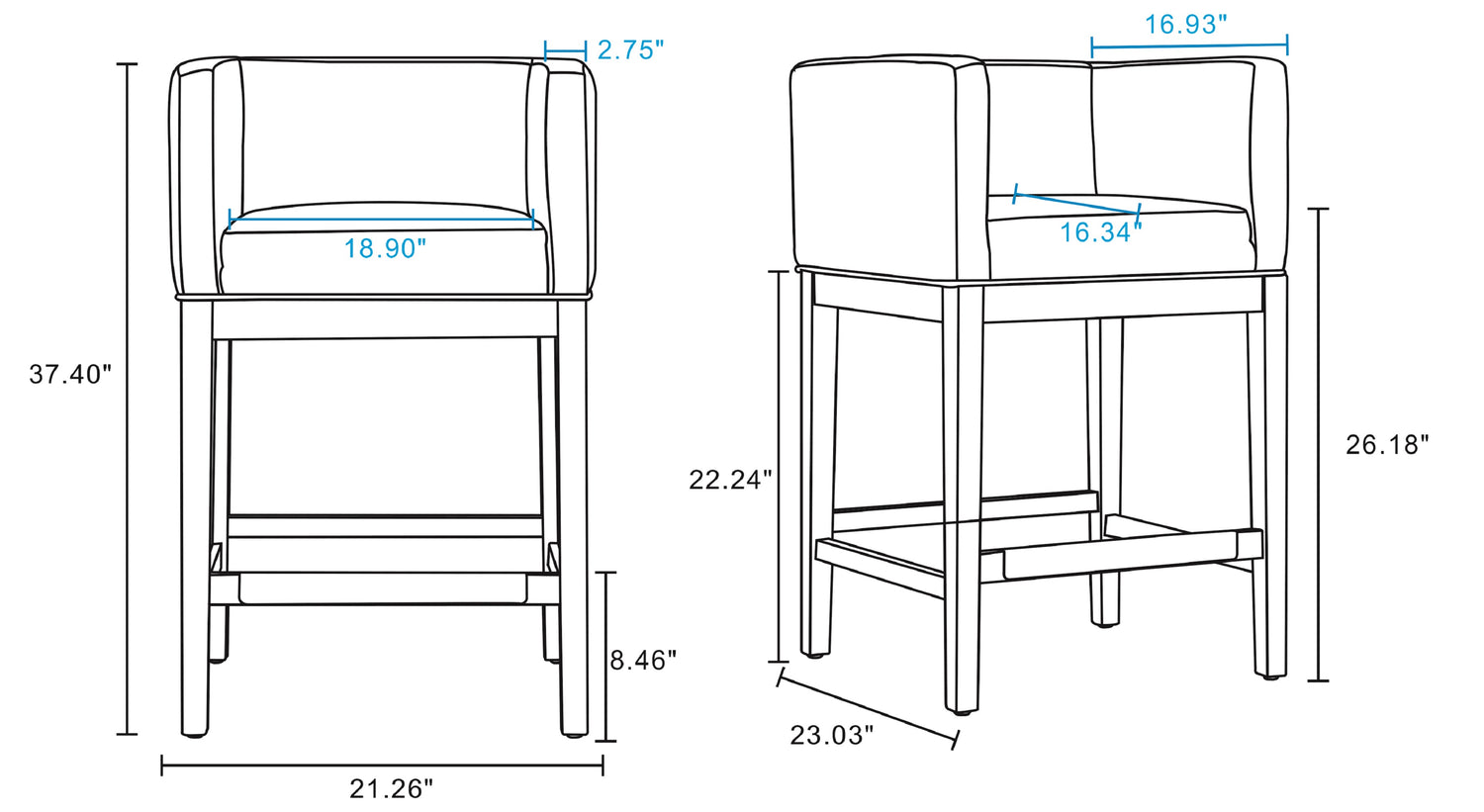 Tight back squared frame upholstery in leather with high density foam, this counter stool brings you comfort and class with it sleek design and gold metal footrest.