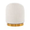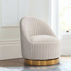 This chair boasts stunning vertical ribbed stitching on a 360-degree swivel golden base for a modern aesthetic. With inner seat dimensions of 21.26 inches in depth and width, it's perfect for unwinding in style.