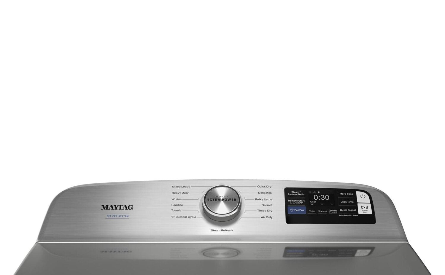 | Dry Cycles | Air Only (90 min); Bulky, Custom Cycle, Delicates, Heavy Duty, Mixed, Normal, Quick Dry, Sanitize, Steam Refresh, Timed Dry, Towels, Whites |
